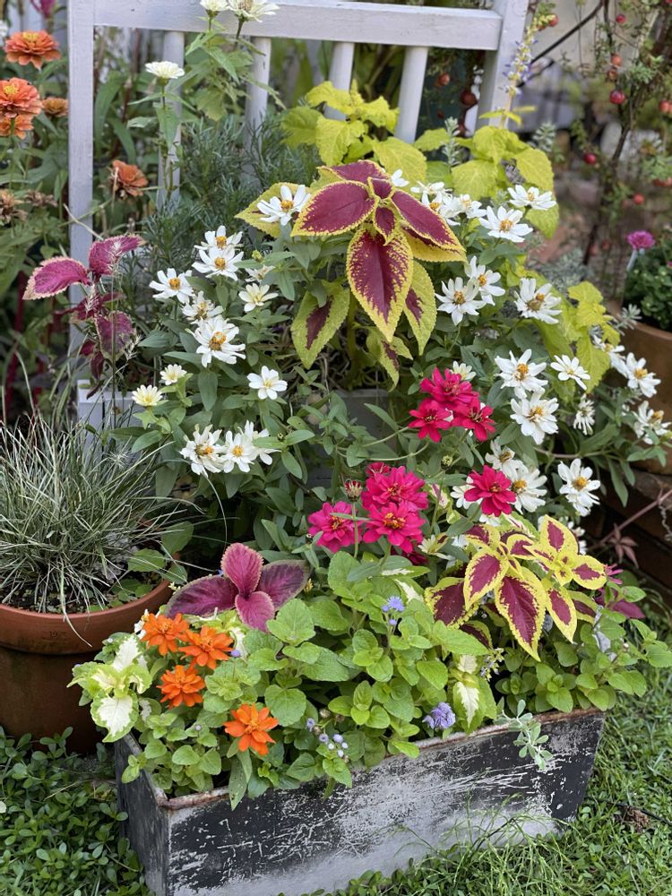 上からベンチプランターのジニア達が覆い被さってます🌼