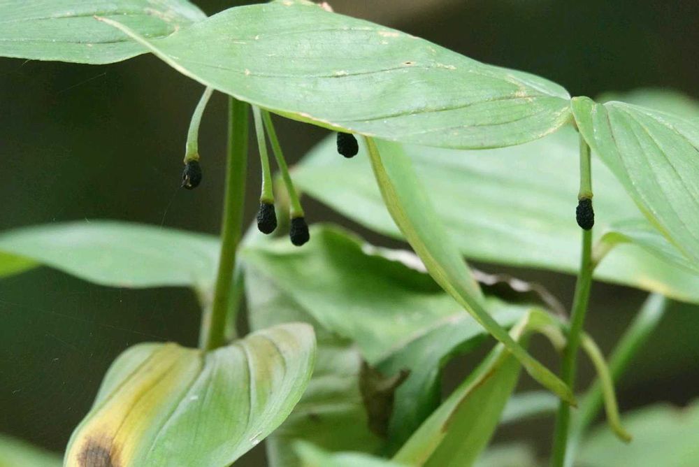 1 マッチ棒が葉陰から顔を出していて、目を惹きました。チゴユリのタネのようです。黒い実から中のタネだけが残された?周りのチゴユリも皆こんなマッチ棒でした