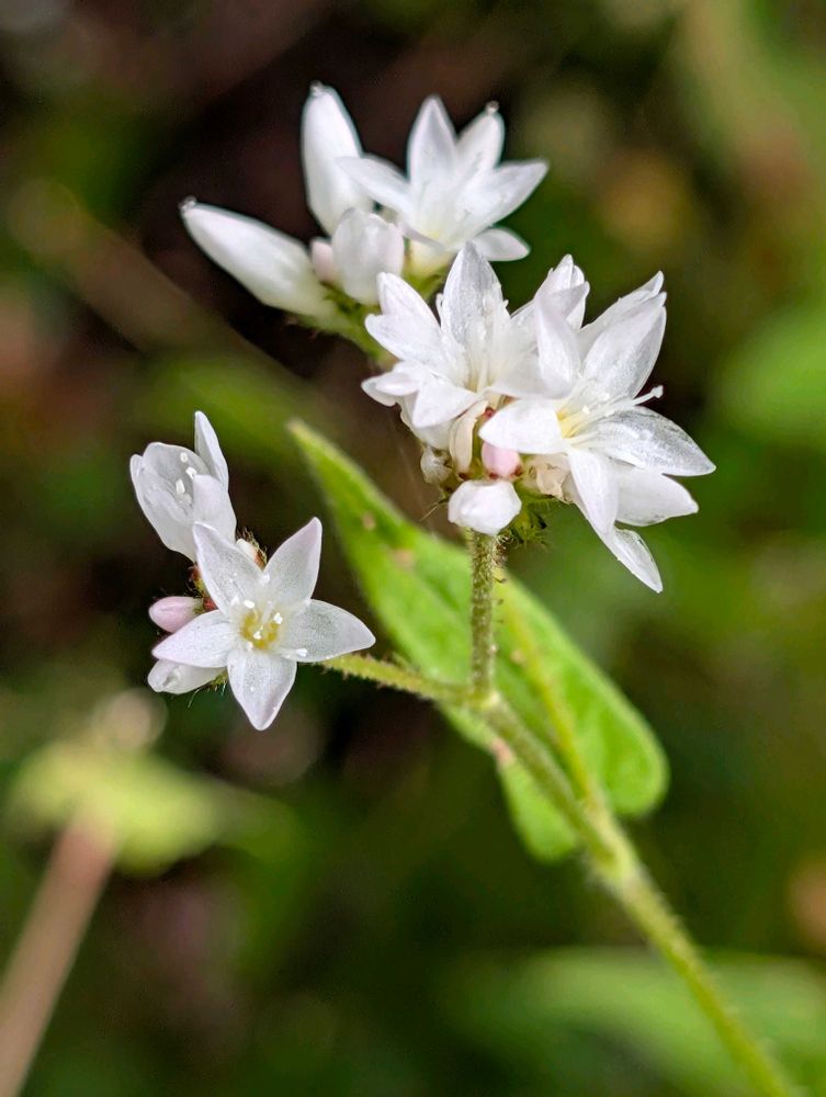 花は枝の先に頭状につく。花柄に腺毛がある。花被はピンク色〜白色。長さ4〜5㎜、5裂。雄しべ8個、花柱は1個で3裂。