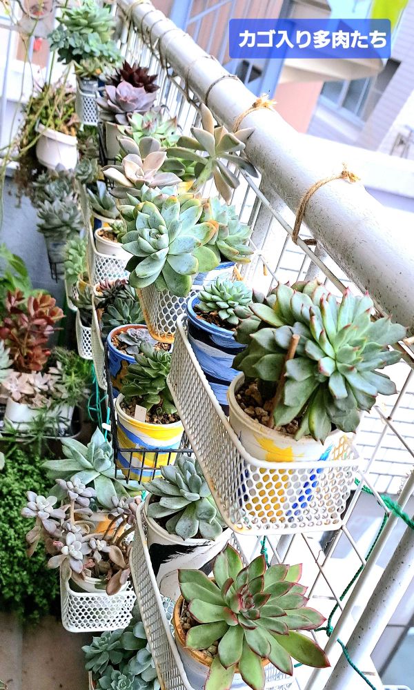 ベランダ手すりの多肉引っかけカゴ(ダイソー製)🍀