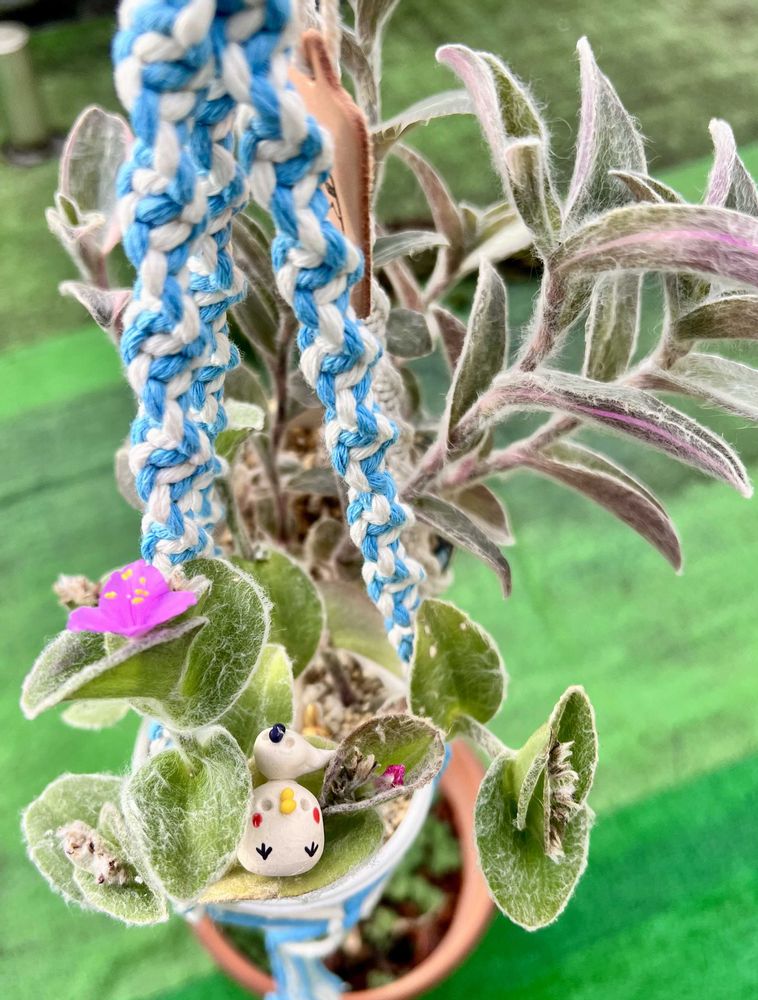 2枚目の白と水色の紐編み編みしてるのをマクラメって言うんだよ💡