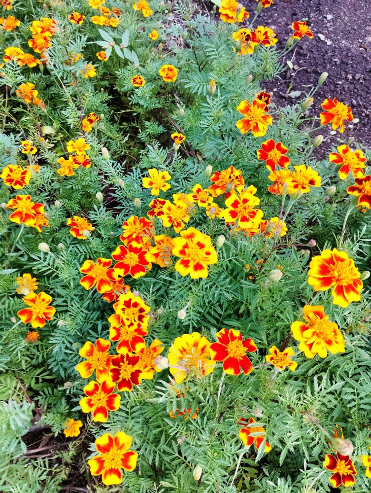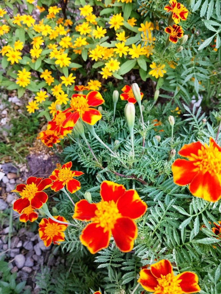バイカラーのマリーゴールドが周りの草花と良い感じで 写真の撮り方も惚れ惚れだよ〜💖 素晴らしい👏