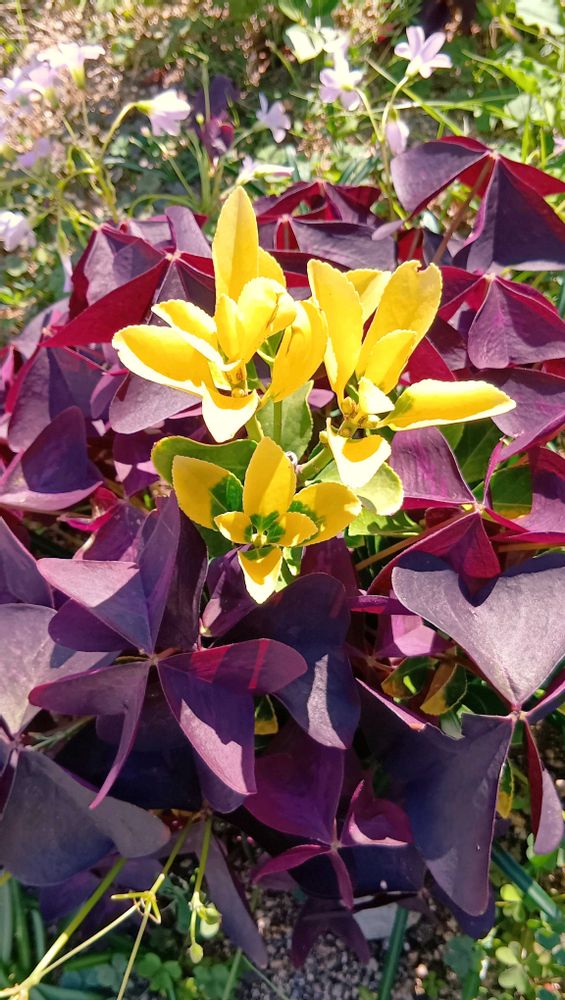 ①小さな黄金マサキの株の周りにオキザリス💞💐ブーケみたいですネ😉🙆❇️