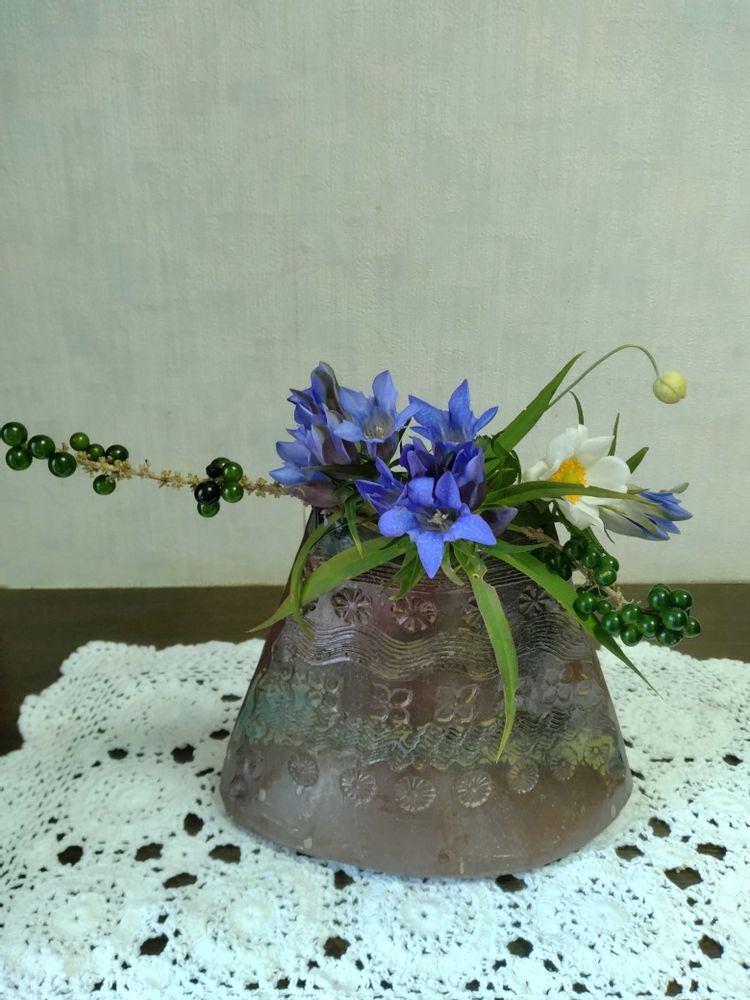 先日の流れるようなガイラルディアの生け花良かったよね〜今日は庭のリンドウ💙💜✨を(庭にリンドウが咲くのが羨ましいなぁ😍💙💜)メインにしての、生け花〜私には真似出来無い生け方デス〜多分私は横に生けるより縦にお花入れてしまうかも〜組み合わせ素敵〜✨👍