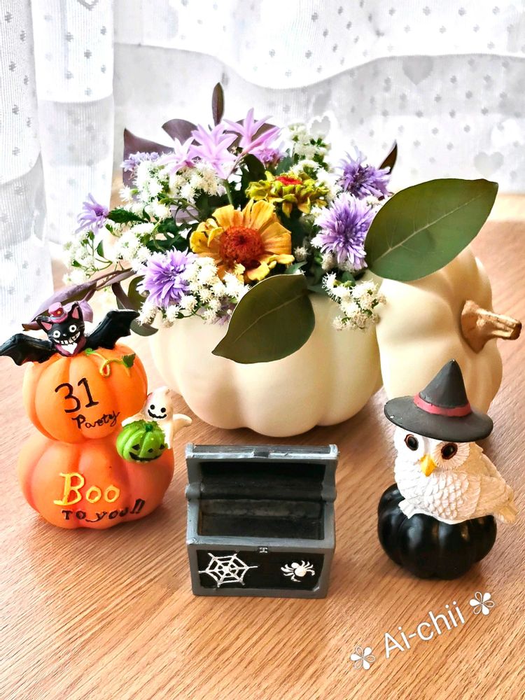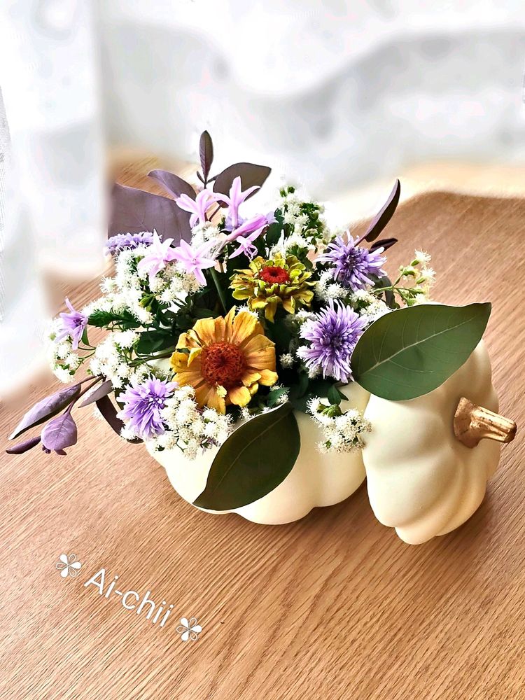 カボチャ🎃🤍に生けた💐アレンジも