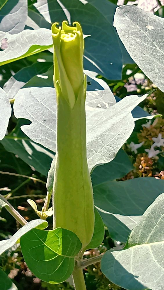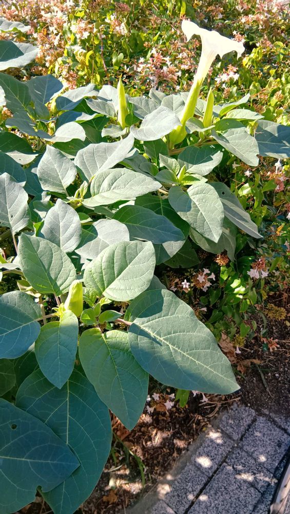 こちらは こぼれ種?🐦️虫媒花💐北米原産で上向きにラッパ様の🤍白っぽいお花③枚目に咲いてます🧚♂🎶🎺