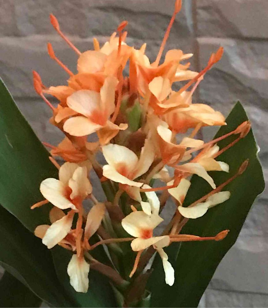 ジンジャーの花ってどんなのかと思い、植木鉢に植えてみましたが、葉がどんどん大きくなり水がかなり必要でした😘やっと花が咲きました🌼