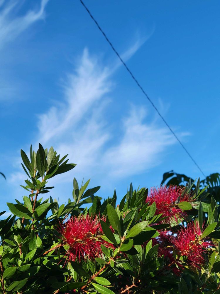 まだブラシの木の花咲いているよ❤️🌿陽射し青空︎ ︎︎︎︎💙