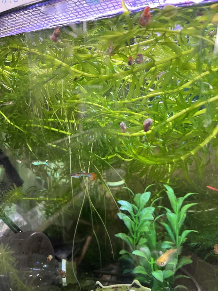 我が家のグッピーやメダカ、アカヒレ(コッピー)が入っている水槽です🌿🫧🐟🌱 一旦カットした水草(ウィローモスやアナカリス)が再び茂って来ました👍 すごい繁殖力ですね😆👍🌿🌿