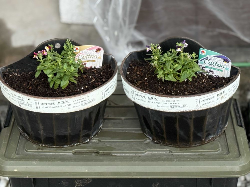 プランターに2苗植え ブリキ鉢に単品植えしました