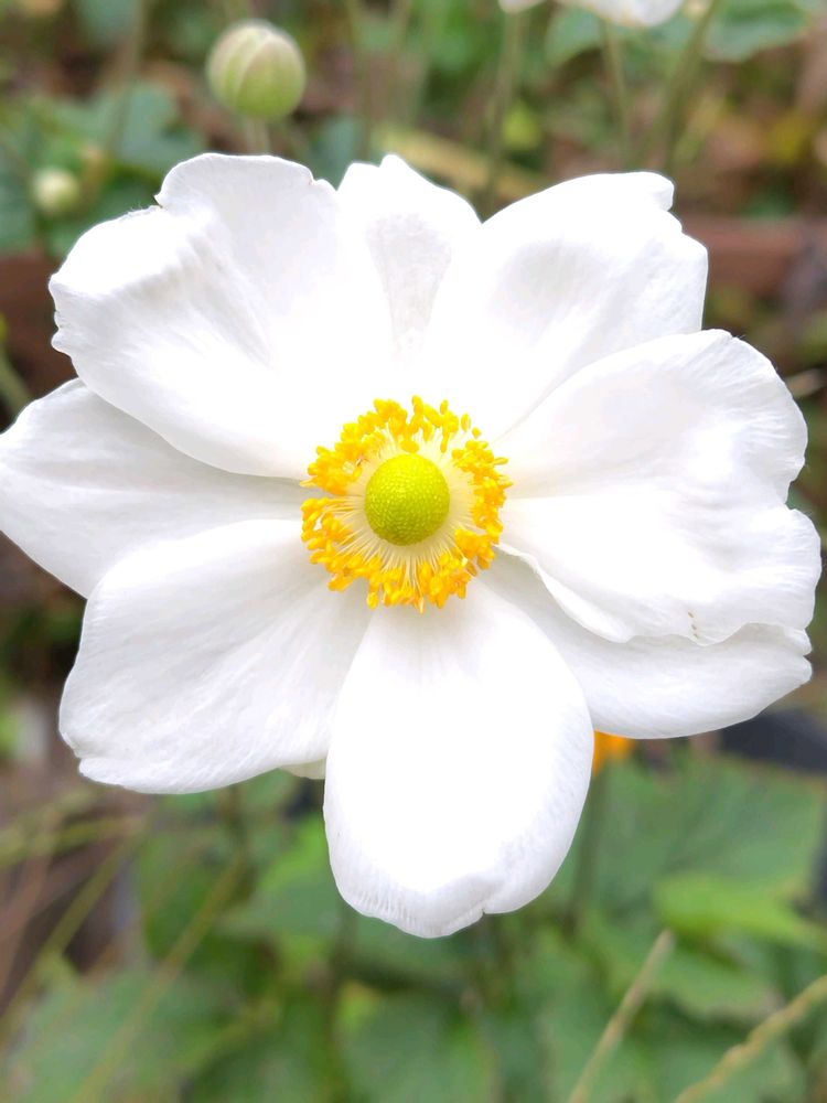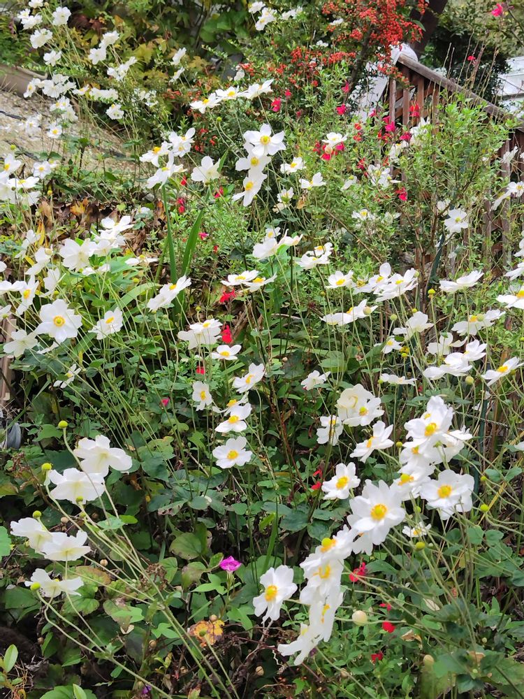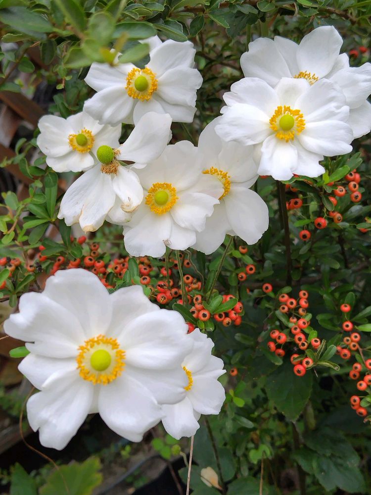 これは庭に咲いている秋明菊で、直ぐ近くにチェリーセージの花が咲き、ピラカンサの実も生っているので、赤と白のコントラストが私もすきです❤️🤍😄