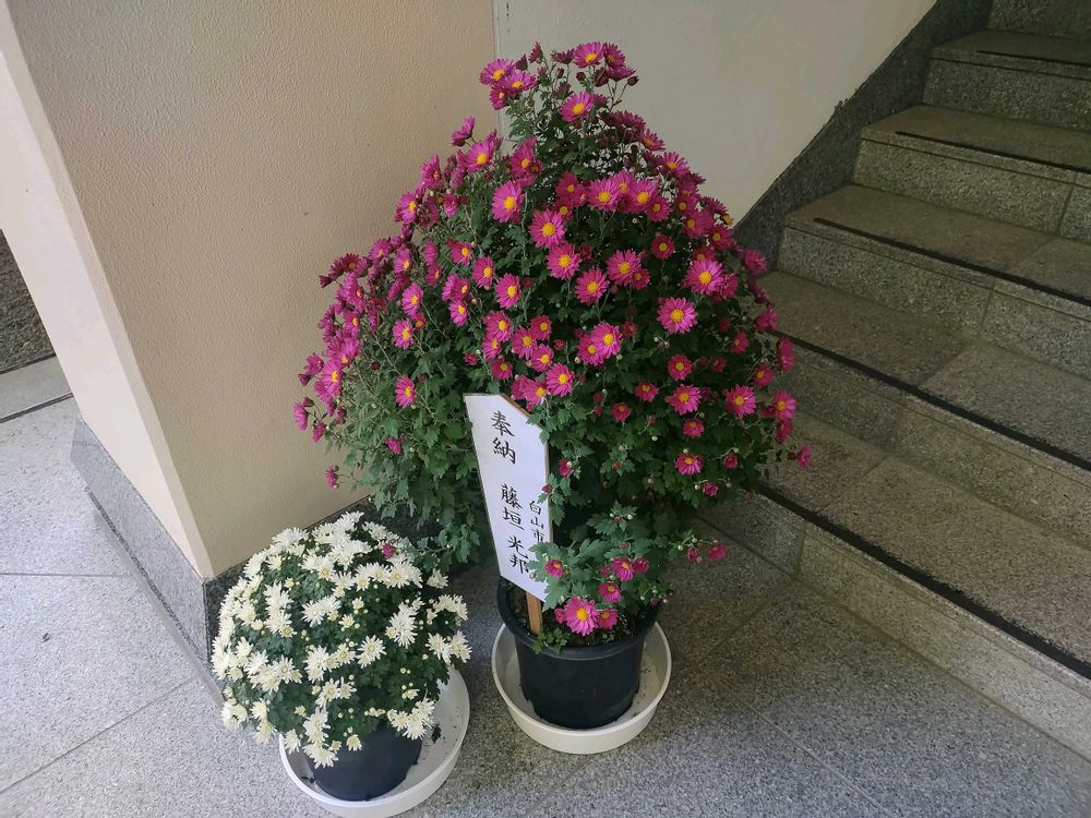白山比賣神社(はくさんひめじんじゃ)には菊理姫命(ククリヒメノミコト)が祀られており、この季節には菊の盆栽が拝殿の入り口に飾られています。
