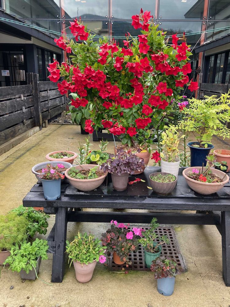 黒石市の津軽伝承工芸館では鉢物がずらりと並んで(中央の赤い花は何でしょう?)マンデビラとでました