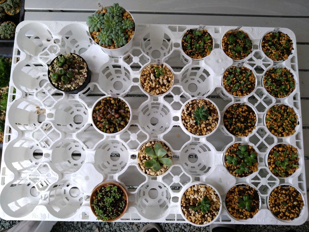 今年の春の実生苗(右側2列)を頂いたプラ鉢に植え替えてこのトレーにセットしたけど