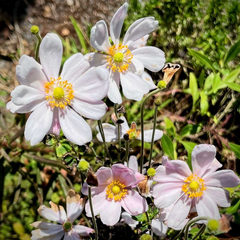 1〜3枚目は淡いピンクのさくらこ、4枚目は、背丈の低いチャボシュウメイギク、5枚目は白八重ですが、引っ越しで連れて来て地植えにしてから元気なく、枯れてはいないのですが開花はしてない状態です。なので、この写真(白八重)は引っ越す前住んでいたうちの花壇で咲いていたものです。なんとか持ち直してまた開花してくれればと思っています🤗🤍