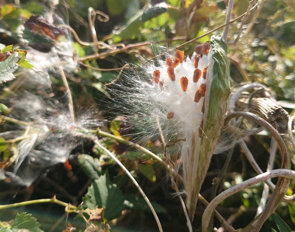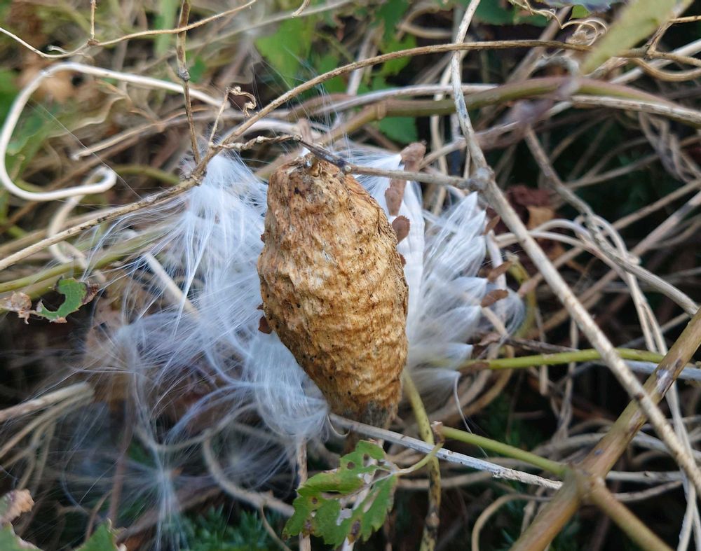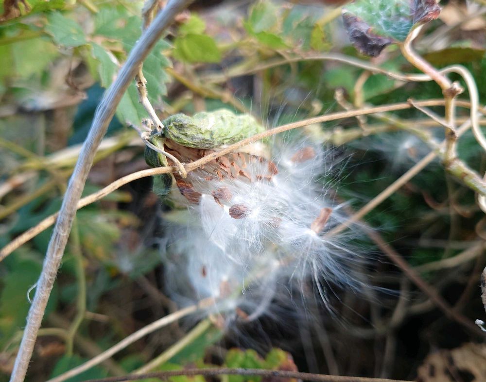 ガガイモの果実(袋果)があったのでちょっと持ち上げてみたらその瞬間、突然にモコモコモコと種子が溢れ出し、うわうわ大変💦(大変じゃないwww)となりながら撮ったもの😂
