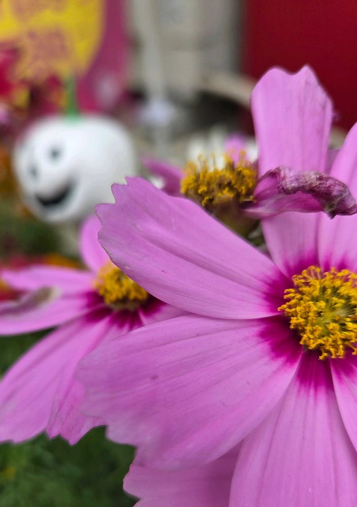 ピンク色のコスモスが綺麗✨ですね。後ろにチラッとお化け👻が写っていますね。Halloween🎃ですね。