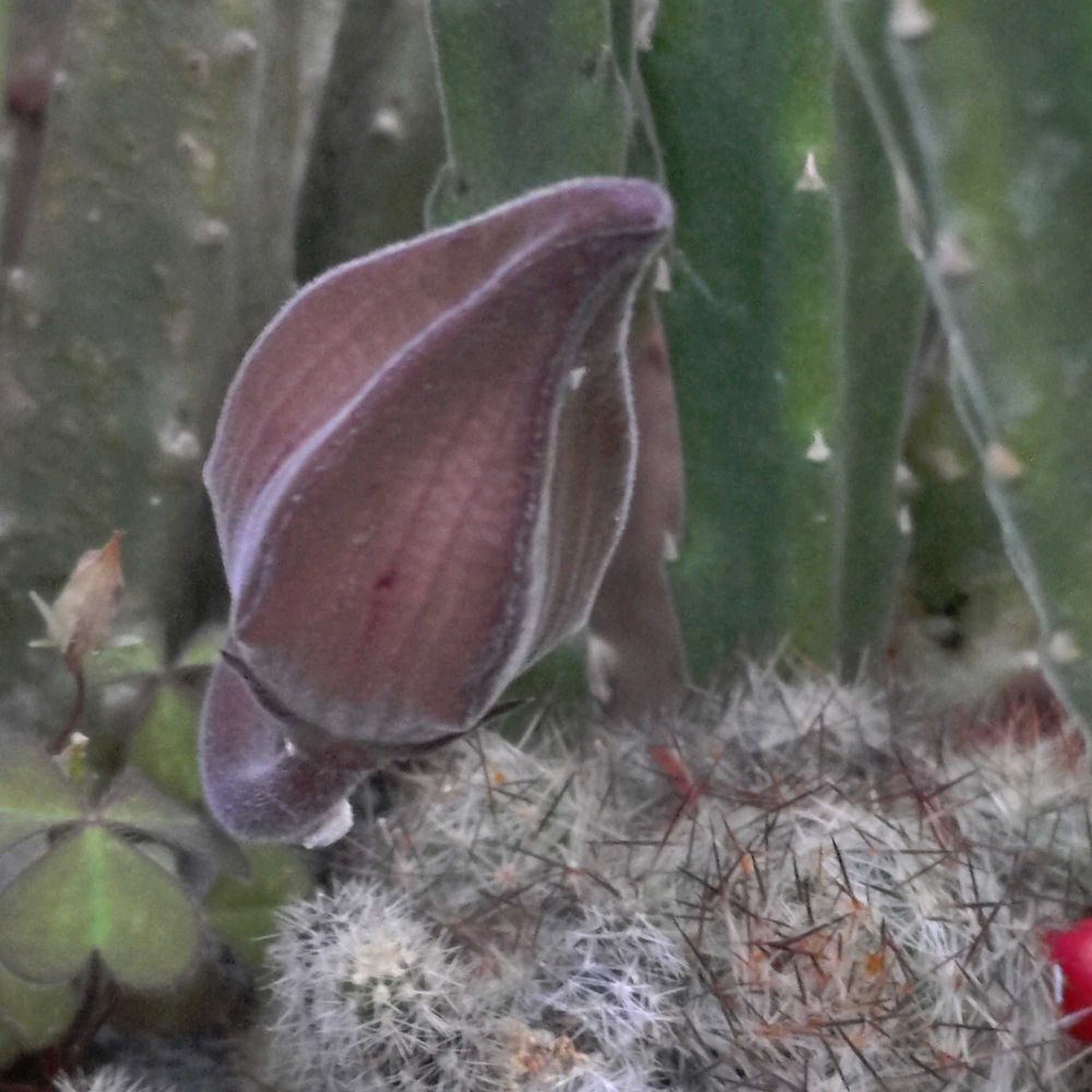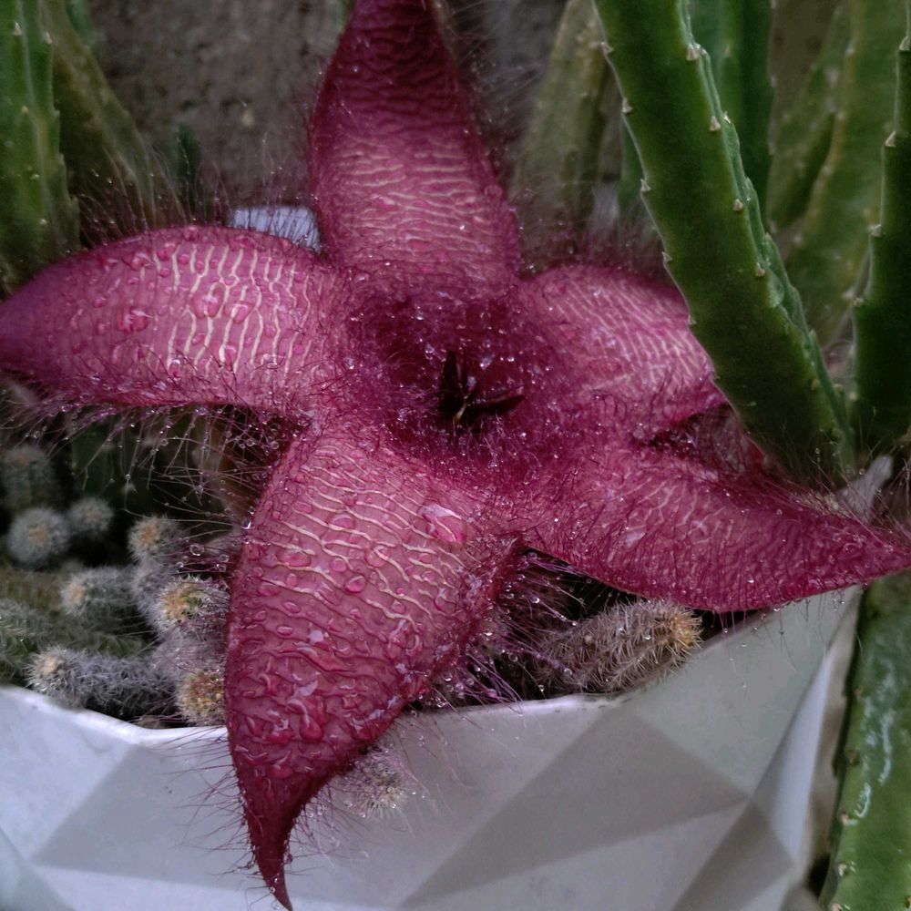 スタペリア〜ウンウン温室が似合いそうだけど、我が家は外に放ったらかしデス〜蕾を久しぶりに発見してビックリ〜蕾は5センチくらいで、花は開いたら7〜8センチはあります〜形はヒトデで、色はアズキ色?サボテン🌵みたいな多肉から、まさかのこんな花にビックリだよね〜🤭✨