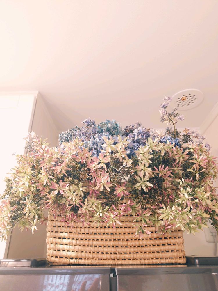 お庭で摘んだアジサイ&ガクアジサイの二種コンビにして…フタが半分破損しちゃったラタンバスケットを活用してみました。
