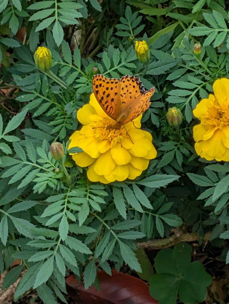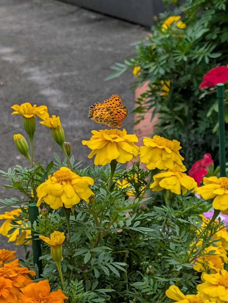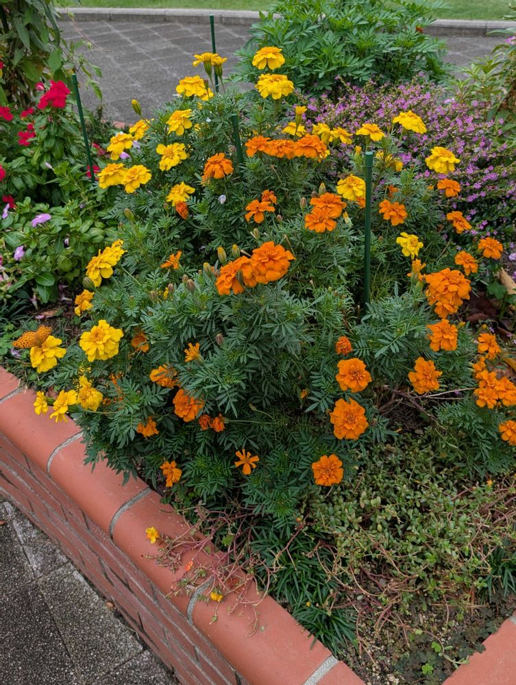 ちょうど通りかかった花壇に綺麗なジニアとマリーゴールドが植えてあり、蝶々が食事中でした🌼🦋