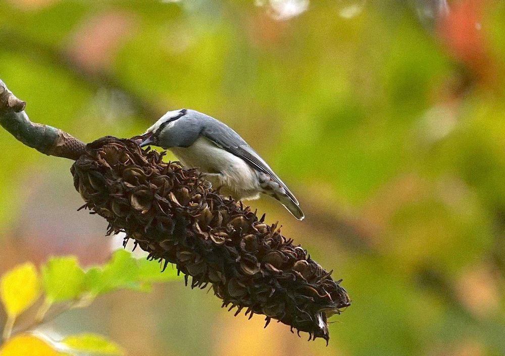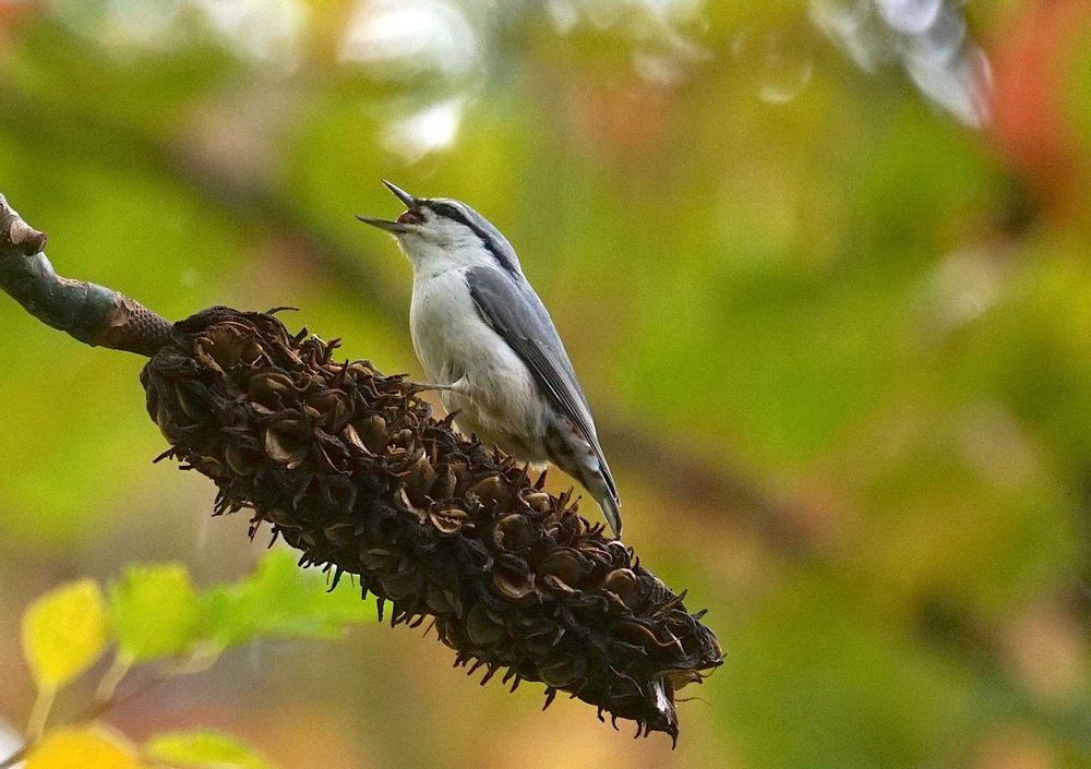 ホウノキの実をついばんで飲み込むシロハラゴジュウカラさん😆