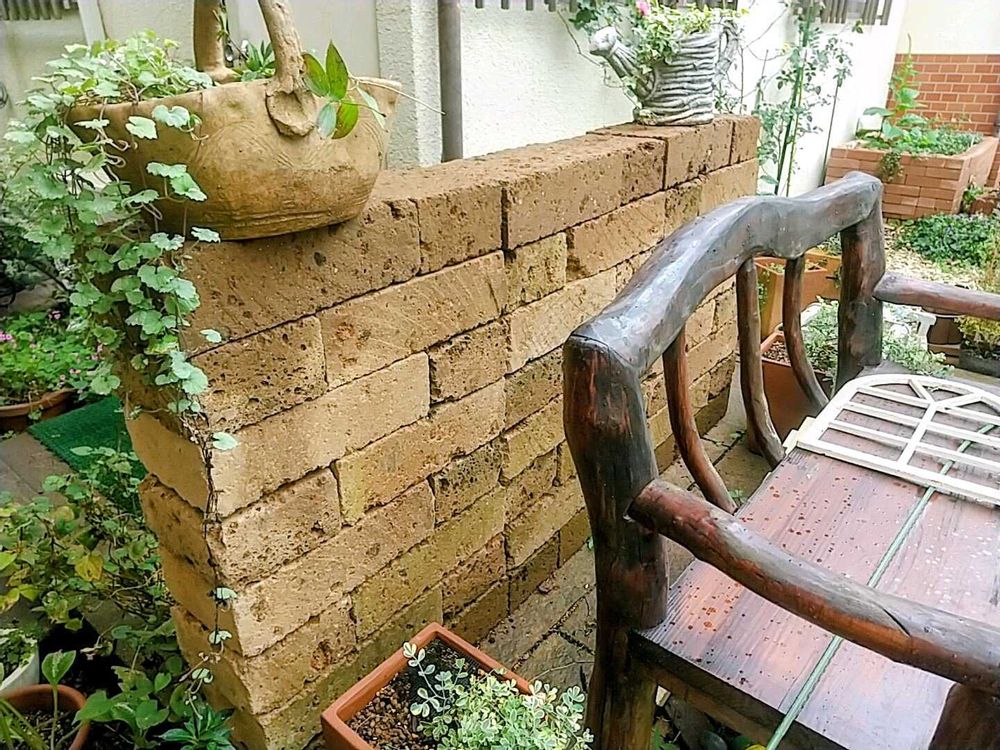 ベンチの後ろに壁がほしくて、ストーンを積み上げてみました💪😌