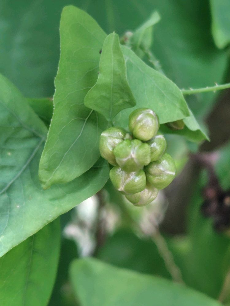 特徴的な三角形の葉っぱで、何かに絡まっています。