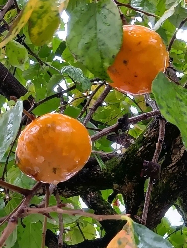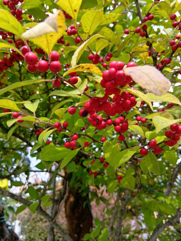 今日は朝から雨柿の実も濡れて可哀想 ウメモドキの赤い実かわいい