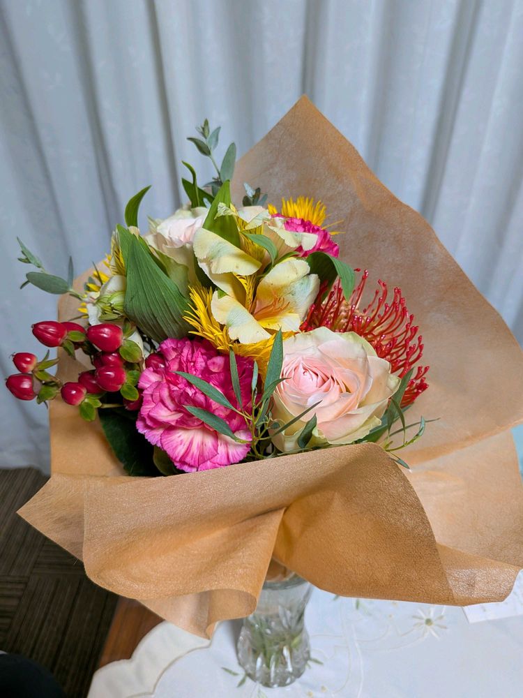 職場の方に恵まれて楽しくお仕事させていただいた上に、会社からと同じ施設の方達から素敵な💐をいただいて帰ってきました。(退職する男性用の💐って黄色やオレンジ系になるんですね。テーマカラーが同じ💐、お花もガーベラ、バラ、ピンクッション…と似ていますが、ショップは違いました)