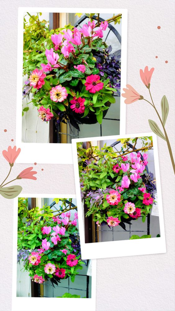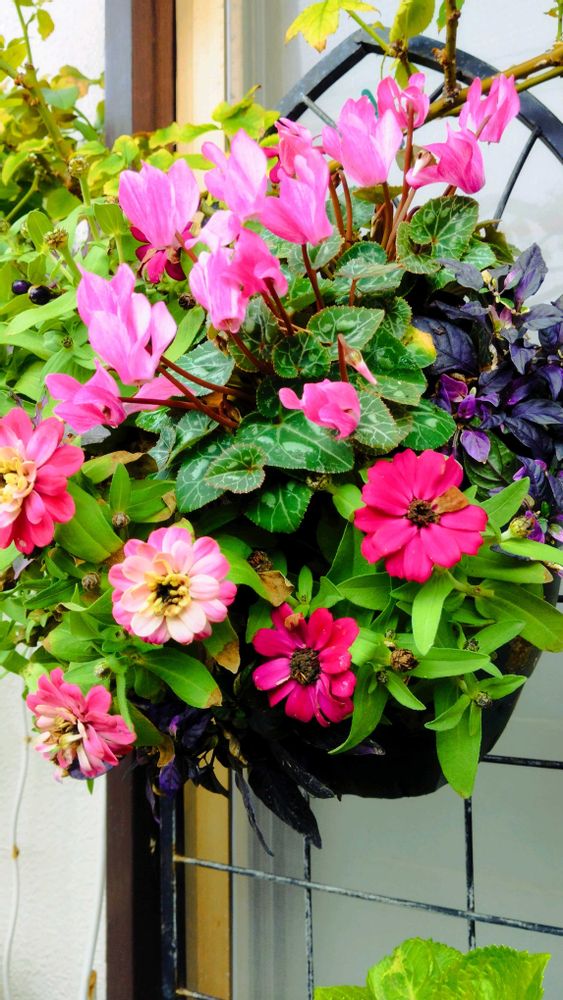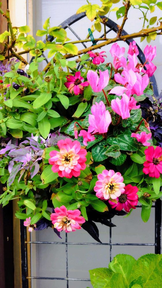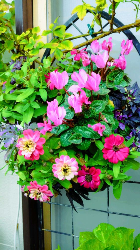 ガーデンシクラメンと八重咲きジニア、斑入り五色唐辛子のハンキング🌿その後