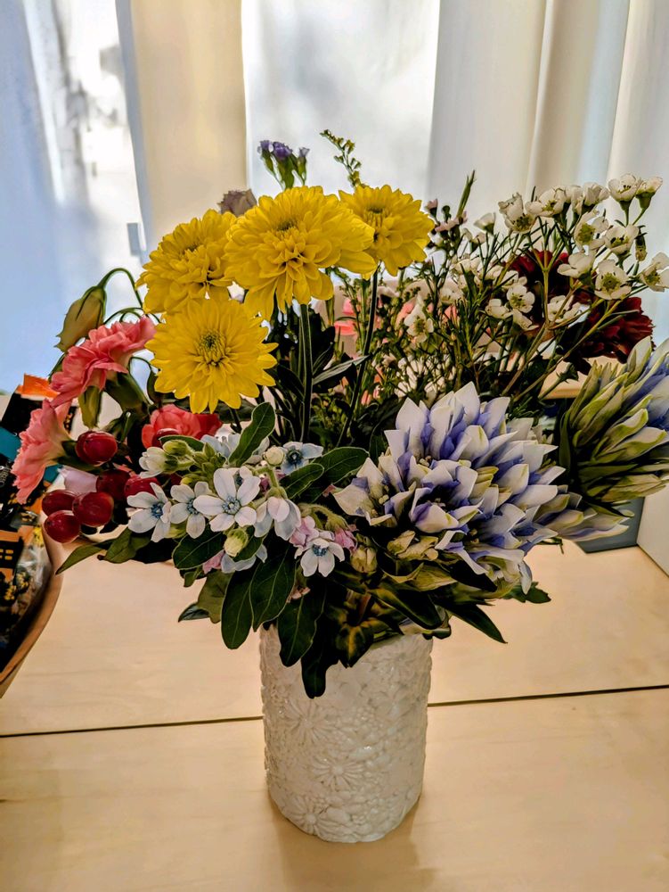 娘が生けたお花💐のガーデンマム💛💛とリンドウ白寿🤍💜🤍のコラボが綺麗でした😊✨