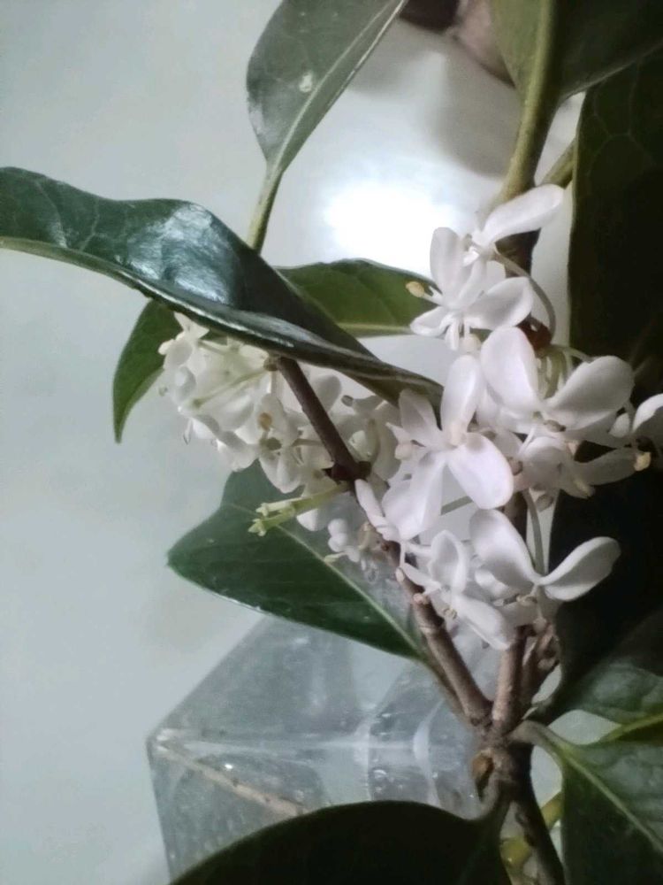 金木犀より2, 3週間ほど遅く銀木犀が咲きました。香りは微香😚