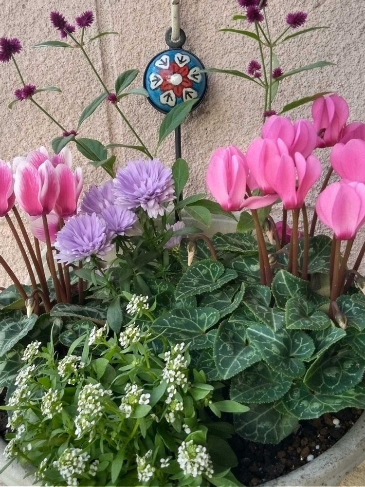 センコウハナビとビクトリアの寄せ植えとシクラメンとアリッサムを寄せ植えしてハンギングにしました