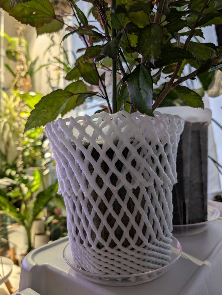 シャインマスカットのネットが5号鉢にジャストフィット レトロな鉢カバーみたいに…