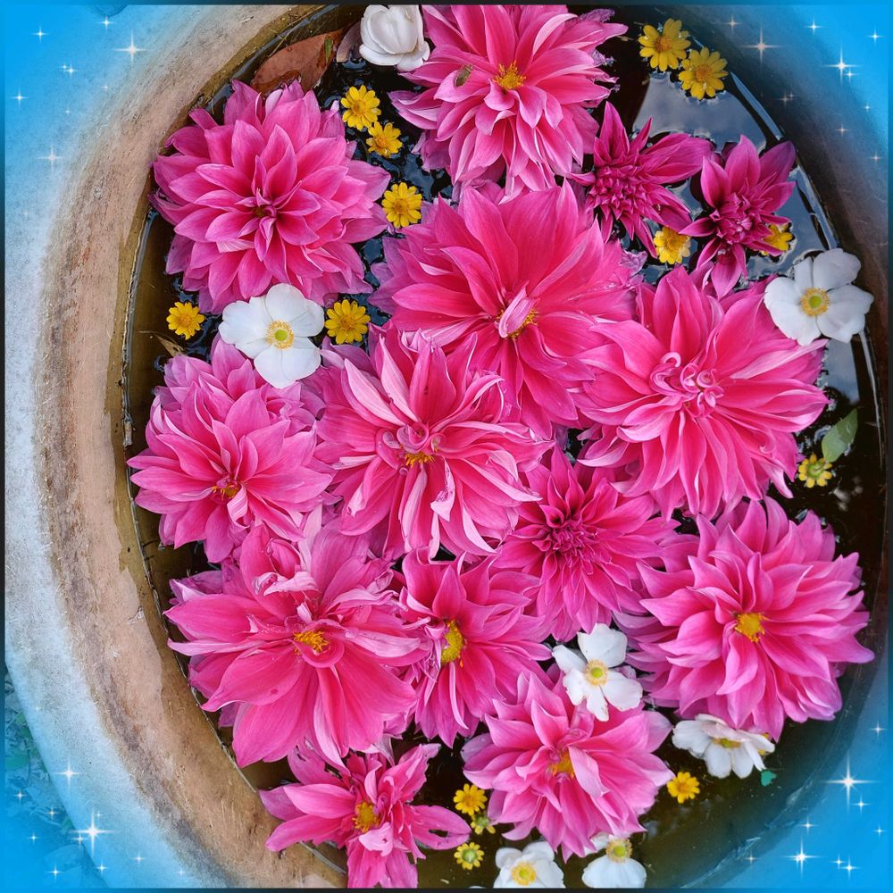 ダリア、千日紅を片付けました。40年前の色あせたベビーバスに、残りのダリア🌸秋明菊ꕤ˖*とメランポジウム💛を少々・・