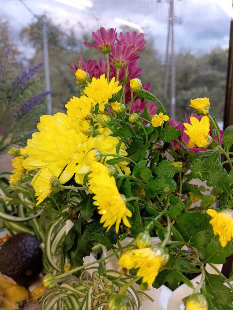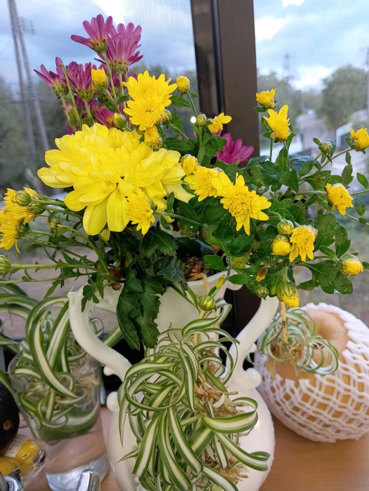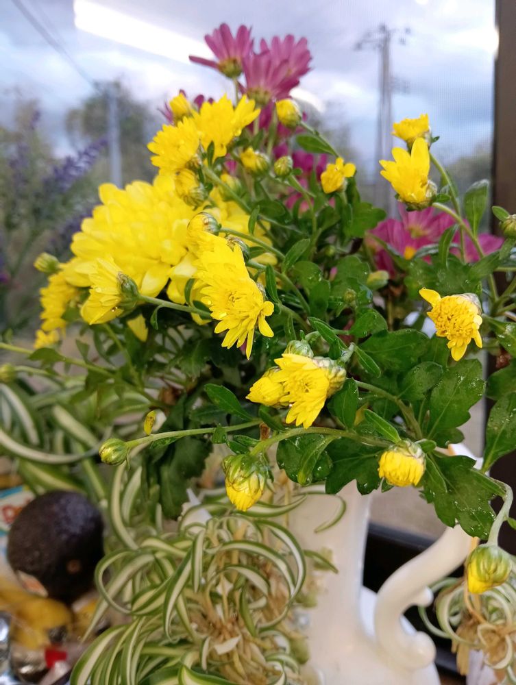 キッチンフラワー💛あいにくの雨、急に寒くなりました😉菊の香りが好きです💛💚