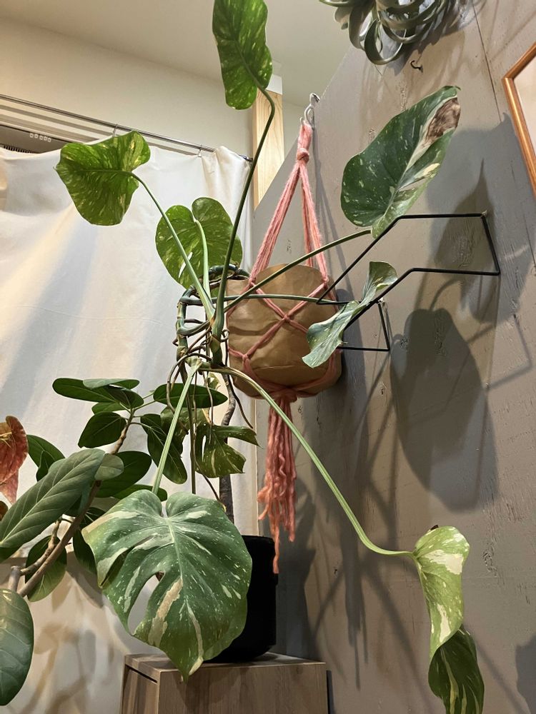 大きなモンスターじゃなくて😆モンステラ、高いところにかけるとはなるほどです。大変ですね。ハンギングから出ようとしてるし😆この状況でもし私なら…モンステラの近くに突っ張り棒か紐を2本取り付けて暴れる葉っぱ達をその棒に紐で軽く固定…とか?