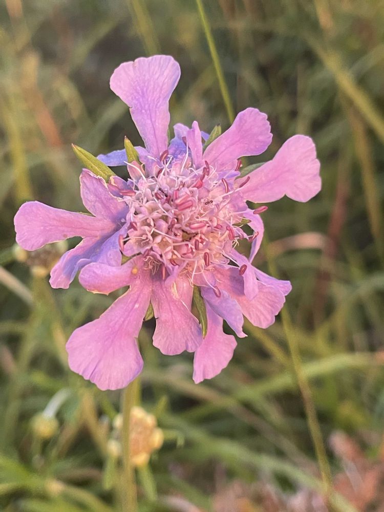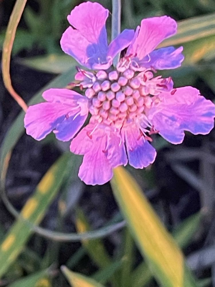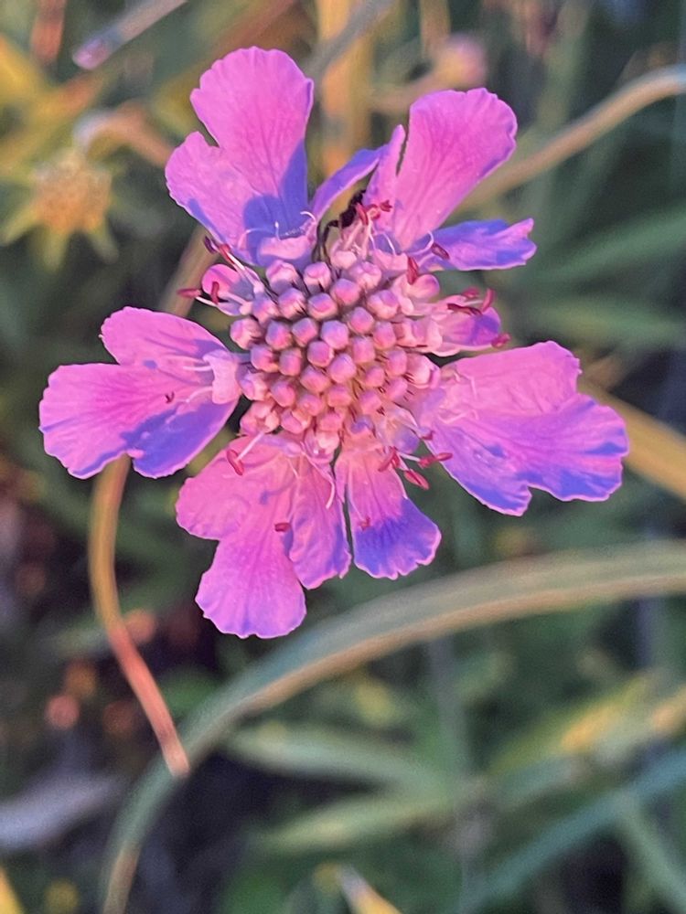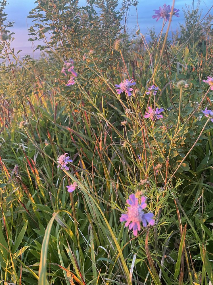 日没のほんのひと時、山肌⛰️が赤く染まる時がありますが、丁度その時、目の前のマツムシソウが2色に見えました😍