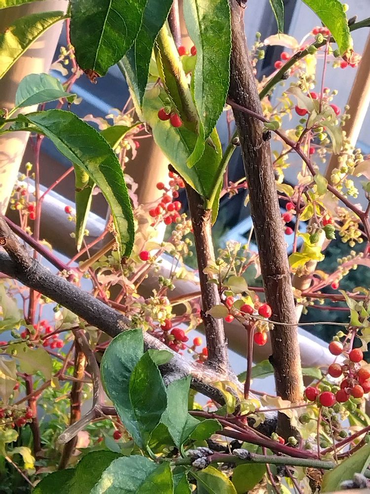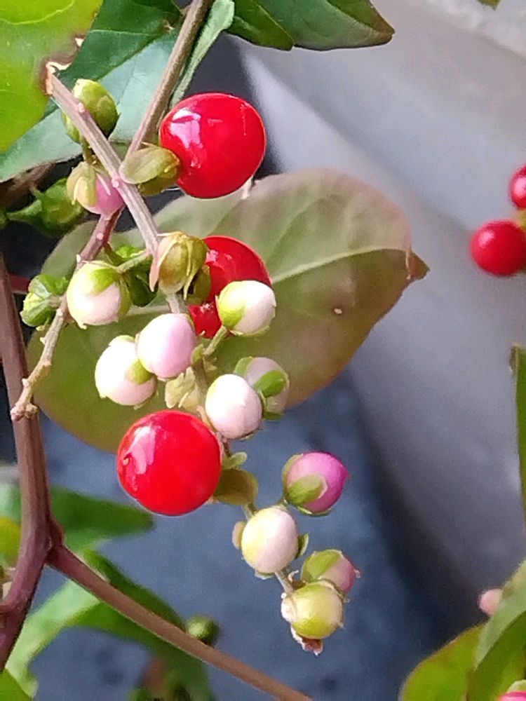 我家のベランダはたくさんの鉢に自由に枝を伸ばしたジュズサンゴが宝石箱を