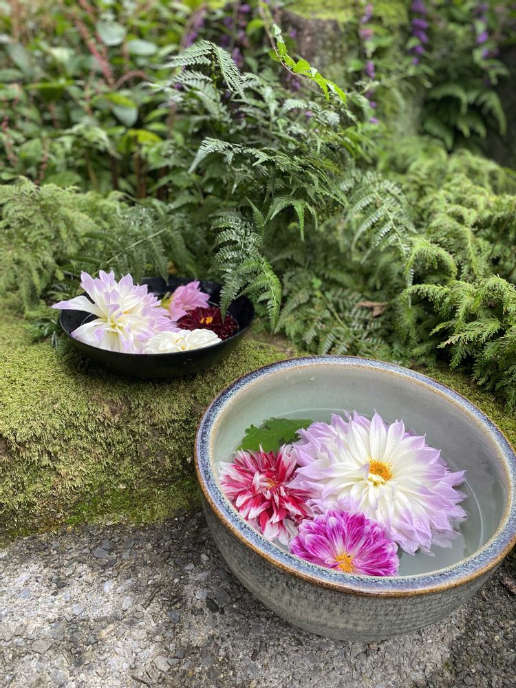 それぞれの鉢に浮かべてあるダリアきれいです。🌸