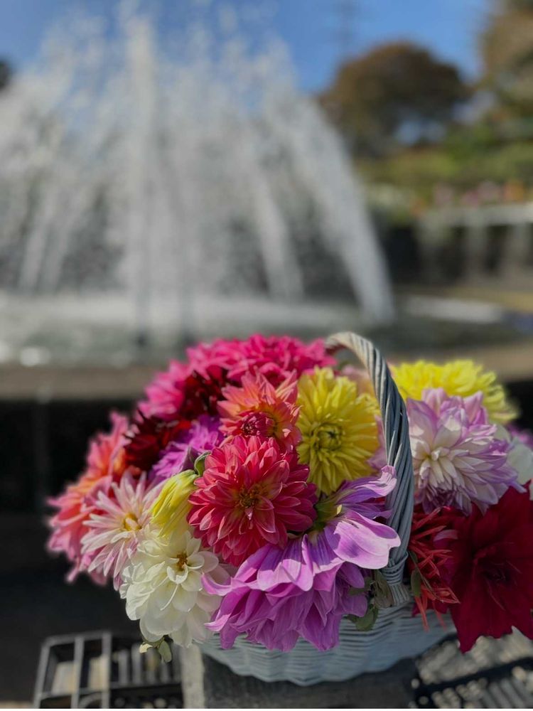 ⑤町田ダリア園・噴水前の籠盛りに生けたダリアたち