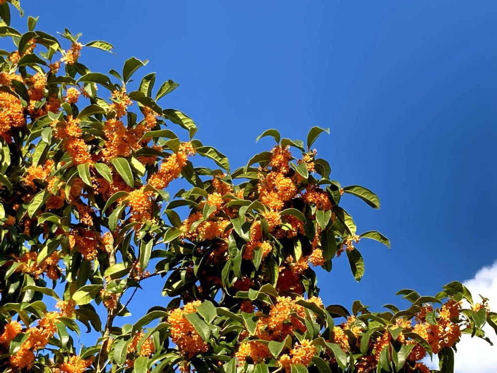 青空に金木犀のオレンジが冴えますが咲く時季は短く散り始めています