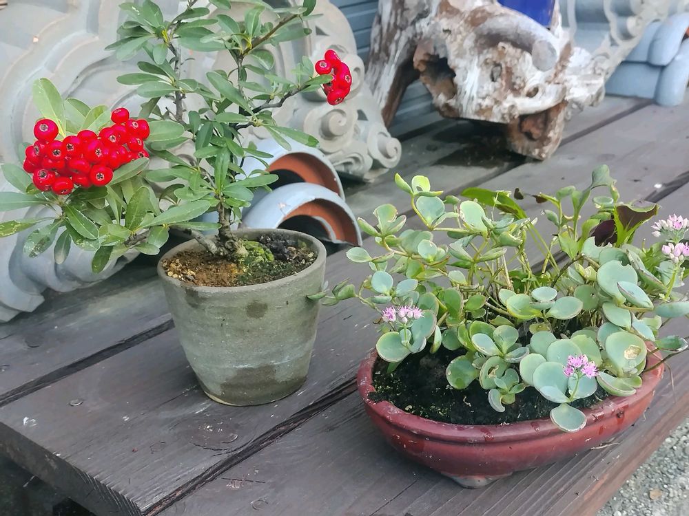 ①常磐山査子(トキワサンザシ 左)と見せばや(ミセバヤ 右)