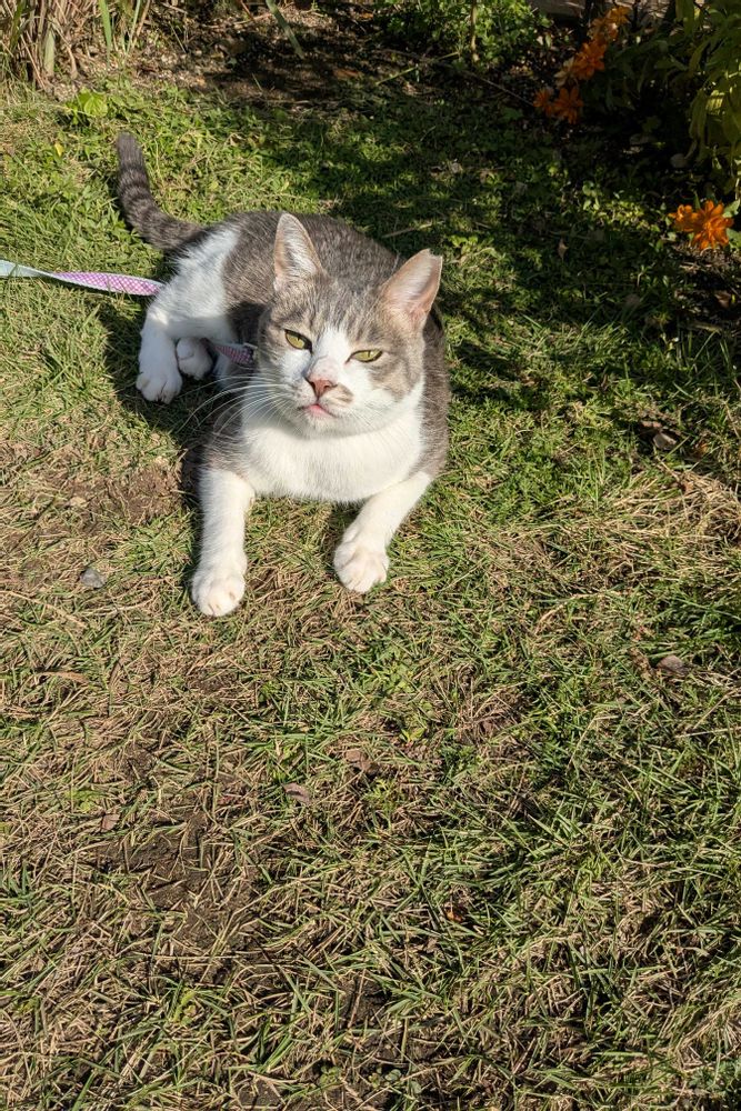p3ニャアニャアなくからリードをつけて庭散歩 でもリードをつけると鈴ちゃん歩けないんですよね 歩けるように訓練してます