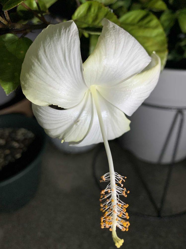 こんばんは🌃ハイビスカス全体的に真っ白いのやっぱりかわいいです😆🙌💕2ヶ月ぶりの開花😳これは嬉しいですね😍これから今までの分沢山咲いてくれたら良いなぁです🤭🤍真ん中が赤いとかなくて真っ白‼️今年の夏にカラーという花育てたとき真っ白でそれだけで玄関が華やかになったので😍ハイビスカス置いたら明るくて良い雰囲気の玄関になりそうです\(//∇//)\🤍✨🤍✨🤍