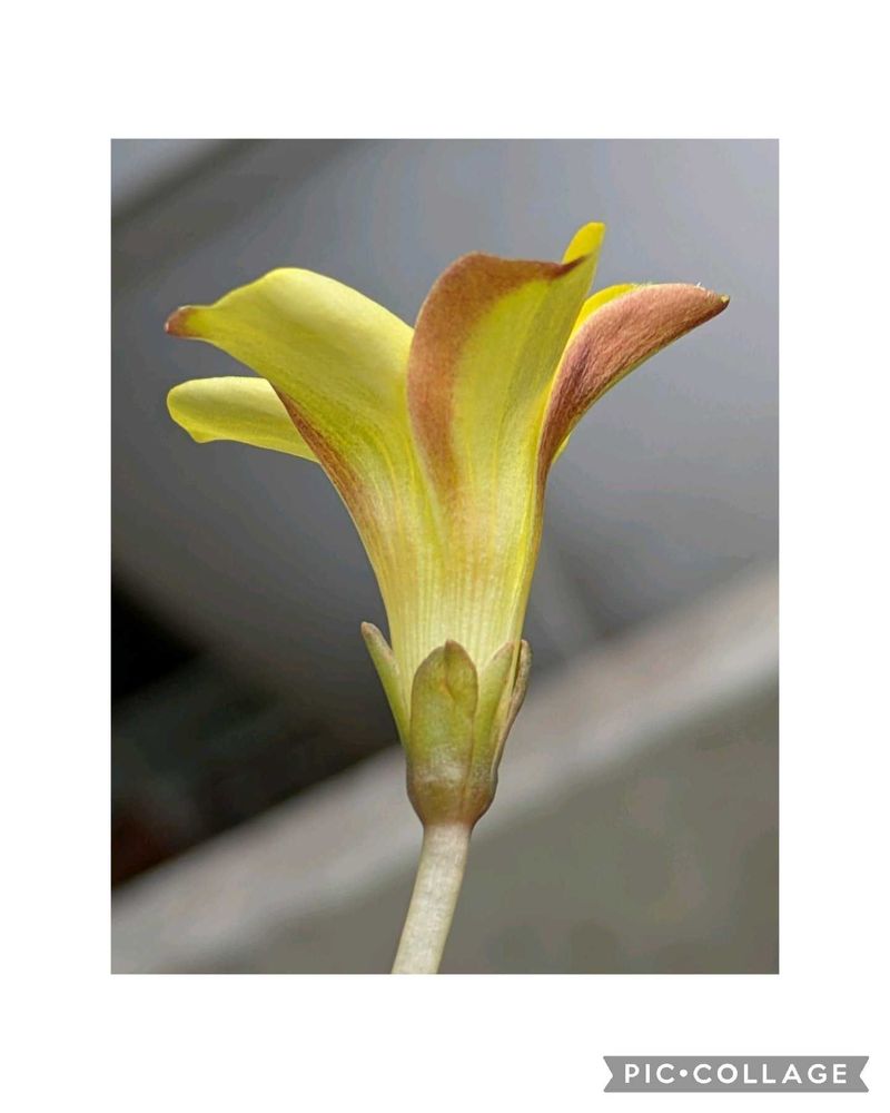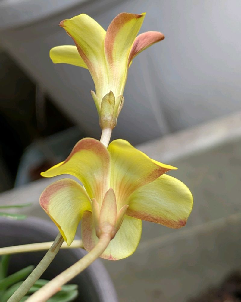 オキザリス ナマクエンシス やっとやっと開花を見ました。正面から見ると、全く黄色です。後ろには赤いラインがうっすらと縁取りに入ります。