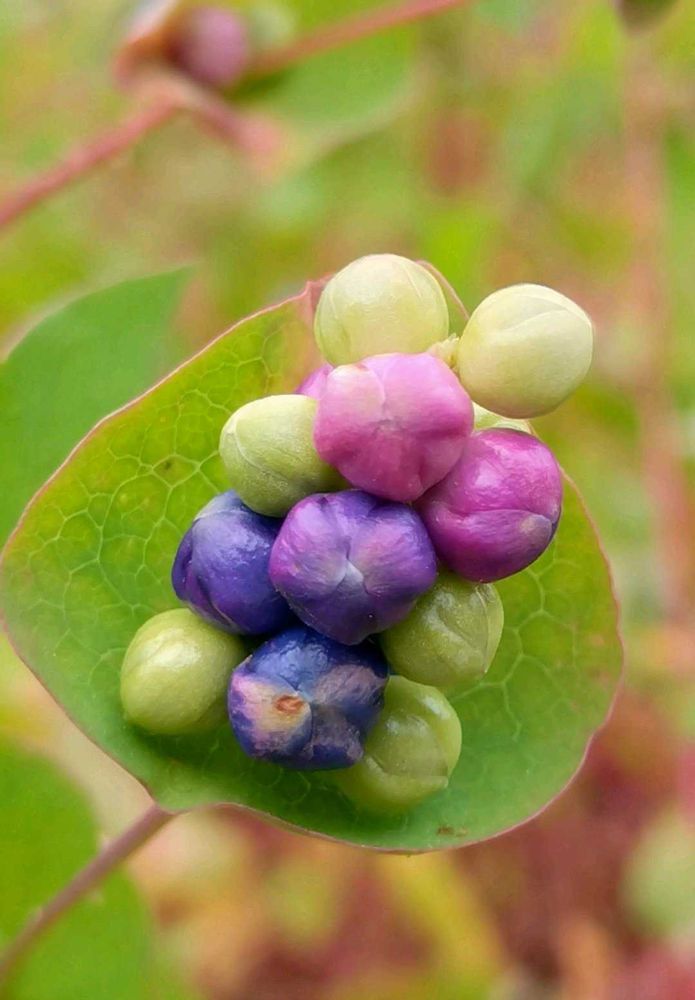 タデ科イヌタデ属のつる性一年草。道端や田の畦、河原などに生える。茎は長さ1〜2mに伸び、下向きの鋭い刺でほかの草や木に絡みつく。葉は互生し、長さ2〜4㎝の三角形で、葉柄は葉身の基部近くに楯状につく。托葉鞘は鞘状の部分は短く、上部は葉状に広がって円形になる。花期は7~10月。茎の先や葉腋に短い総状花序を出し、淡緑色の小さな花が多くかたまってつく。花序の基部には丸い葉状の苞があってよく目立つ。花冠の裂片に見える肉厚の萼片はほとんど開かない。径は3〜4㎜で5裂する。萼は多肉質になって痩果を包み、直径約3㎜の球状になる。色は緑白色から紅紫色、青紫色へと変化する。痩果は黒色で光沢がある。