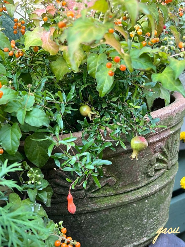 ⑤何度か投稿してるジュズサンゴの鉢(本当は脇役💦)のヒメザクロは小さいけどザクロっぽくなってきました😃 可愛いなぁ〜
