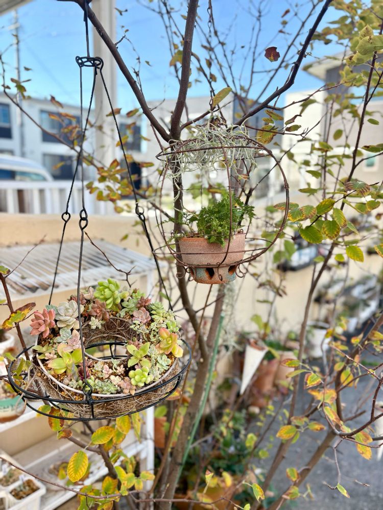 右はアイスクリームコーンの鉢に多肉を植えて吊るしています。
