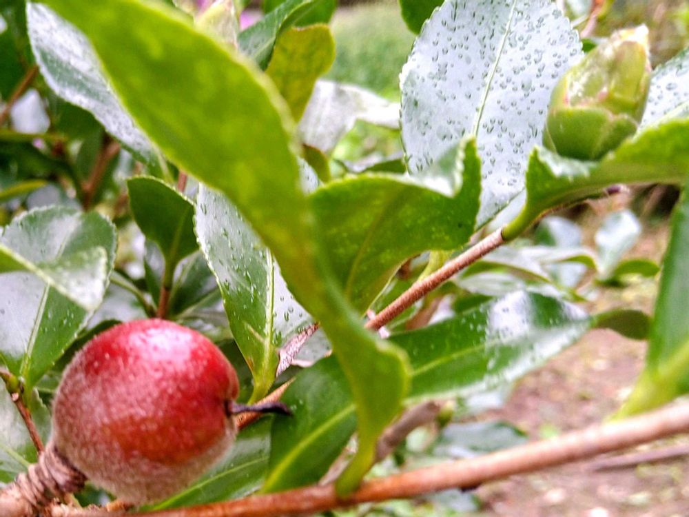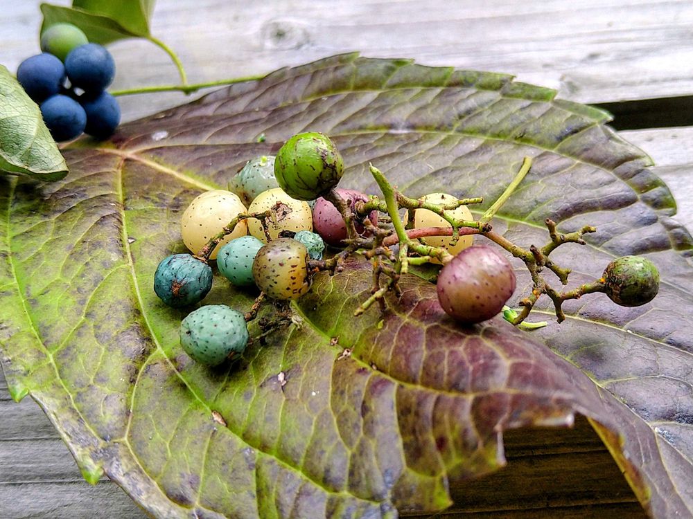②山茶花の実③ブルーベリーの紅葉④野葡萄と紫陽花の葉